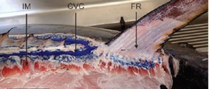 Below is a cross section of a tuna showing the paths (in blue) the lymphatic/hydraulic fluid takes after being propelled by the muscles (in red). IM stands for inclinator muscles, CVC stands for compressible vascular channels, and FR stands for fin rays.